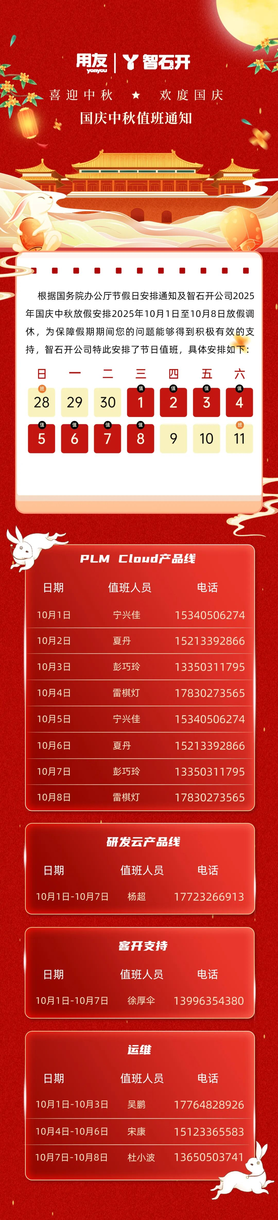 智石开2025年国庆中秋放假与值班通知
